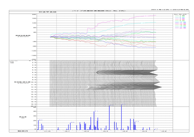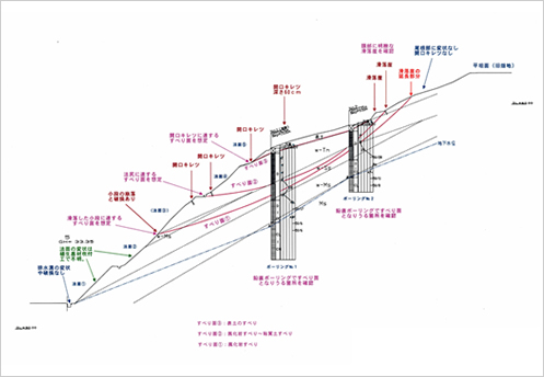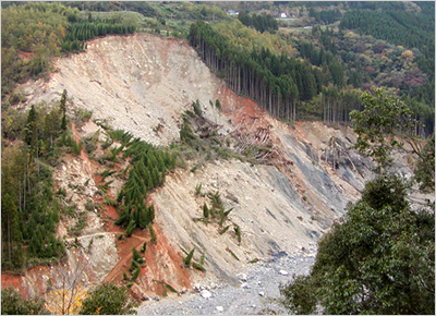 地すべりは、斜面の一部あるいは全部が重力によってゆっくりと斜面下方に移動する現象であり、降雨・融雪・地下水の急激な増加・地震などをきっかけに起こります。