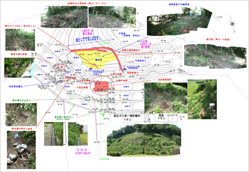 道路沿いにある自然斜面・切土法面・盛土法面等の変状の有無とその状況を点検し、対策工の必要性を判定し、防災カルテを作成します。